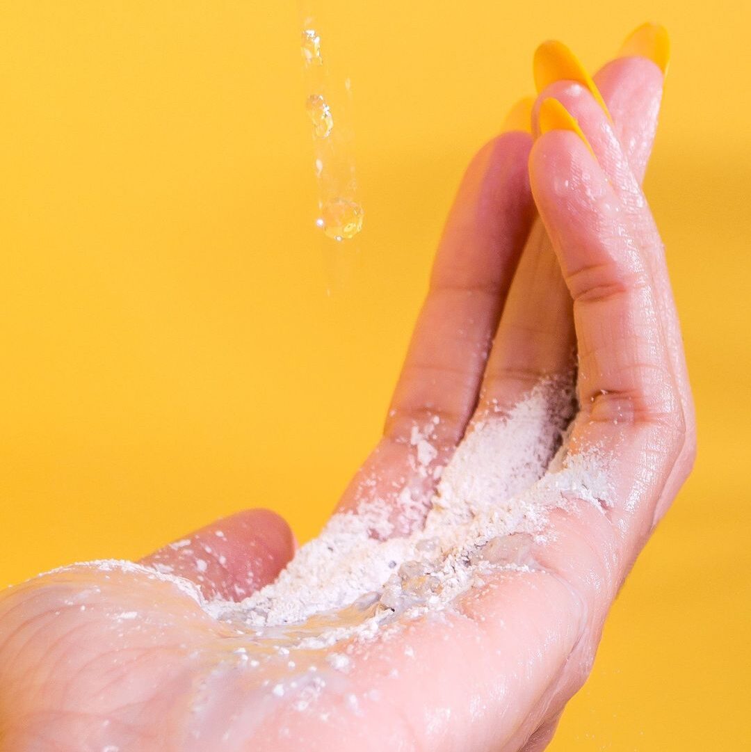 Add a few drops of water to a pea-sized amount of powder and emulsify together to activate the formula. Tweak your mixture’s ratio depending on whether you want a stronger scrub with a thicker paste (powder > water) or a light, foamy lather for a gentle, buffing cleanse (water > powder).