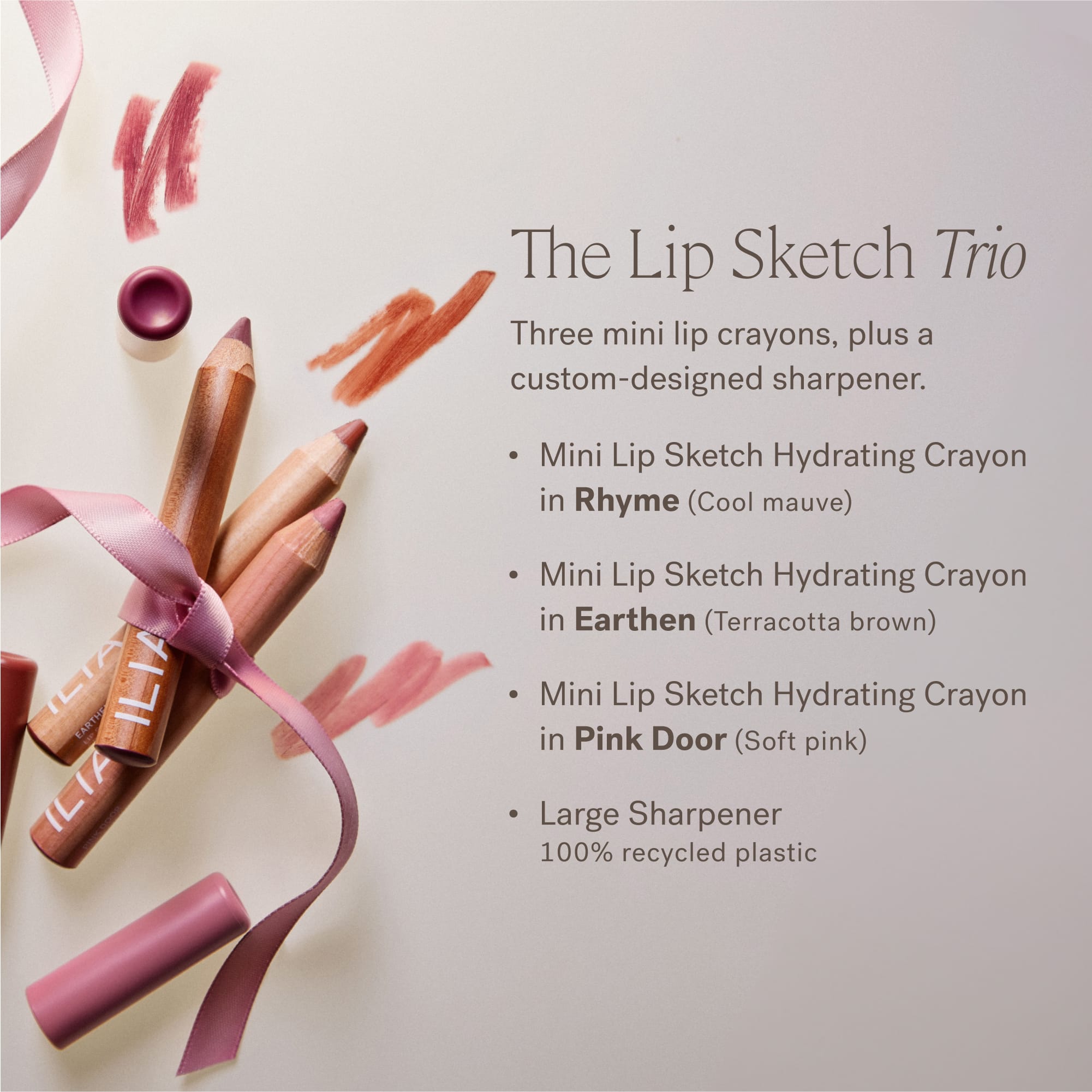 Verwöhne deine Lippen mit satter, langanhaltender Farbe. Dieses Geschenkset in limitierter Auflage enthält drei beliebte Farbtöne des Bestsellers Lip Sketch Hydrating Crayon in einer verschenkbaren Minigrösse sowie einen speziell entwickelten Spitzer.